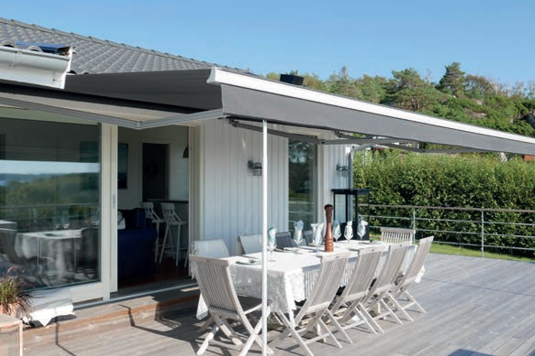 Markisen på bilden är extrautrustad med vindstag, finns som tillbehör. Pris inkl. moms.